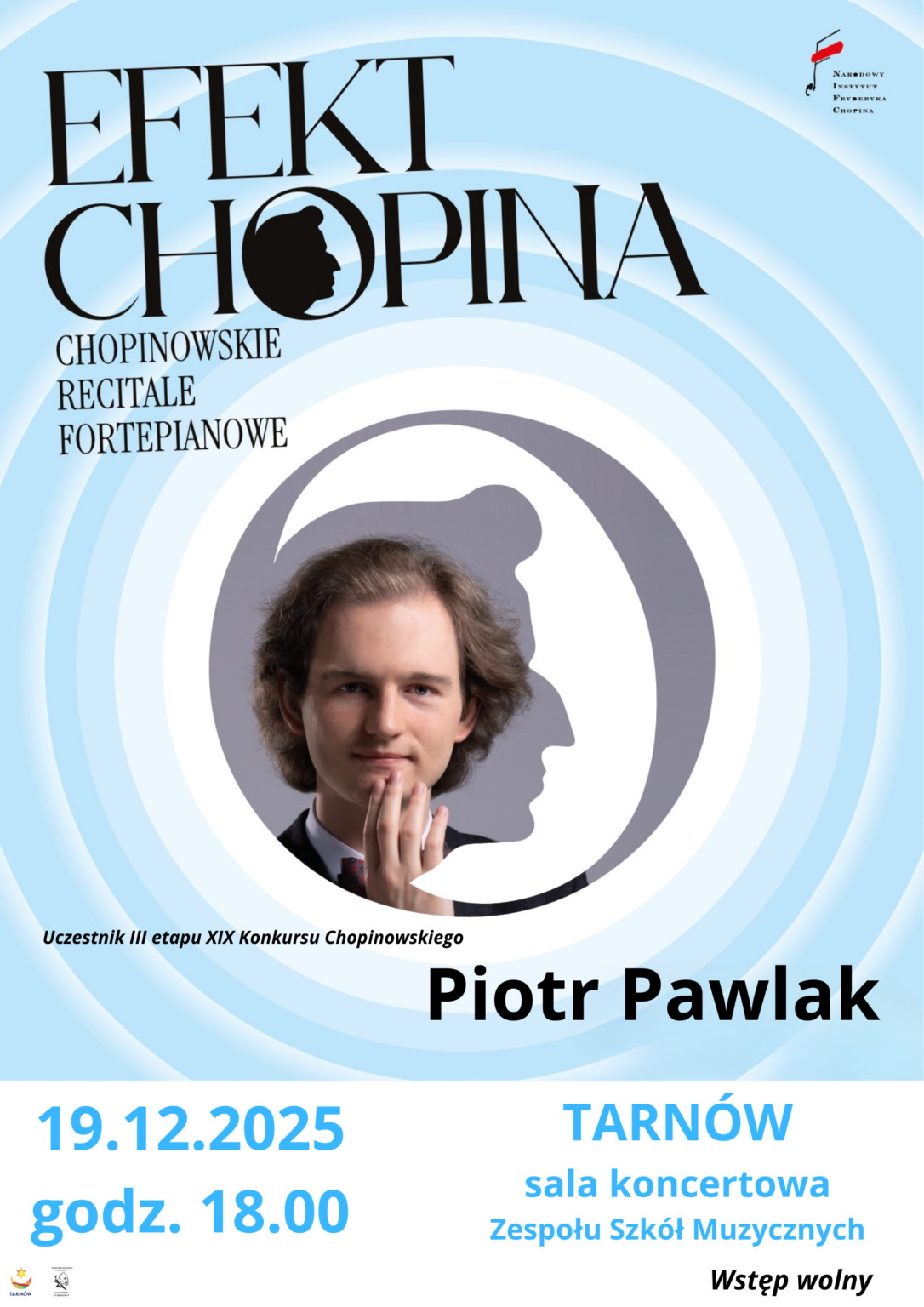 Trzecim pianistą, który zagra przed tarnowską publicznością w ramach Chopinowskich Recitali Fortepianowych „Efekt Chopina” będzie uczestnik trzeciego etapu tegorocznego XIX Konkursu Chopinowskiego, Piotr Pawlak. Jego recitalu posłuchać będzie można w piątek, 19 grudnia o godz. 18 w sali koncertowej Zespołu Szkół Muzycznych przy ul. Lippóczy’ego 4. Wstęp wolny.