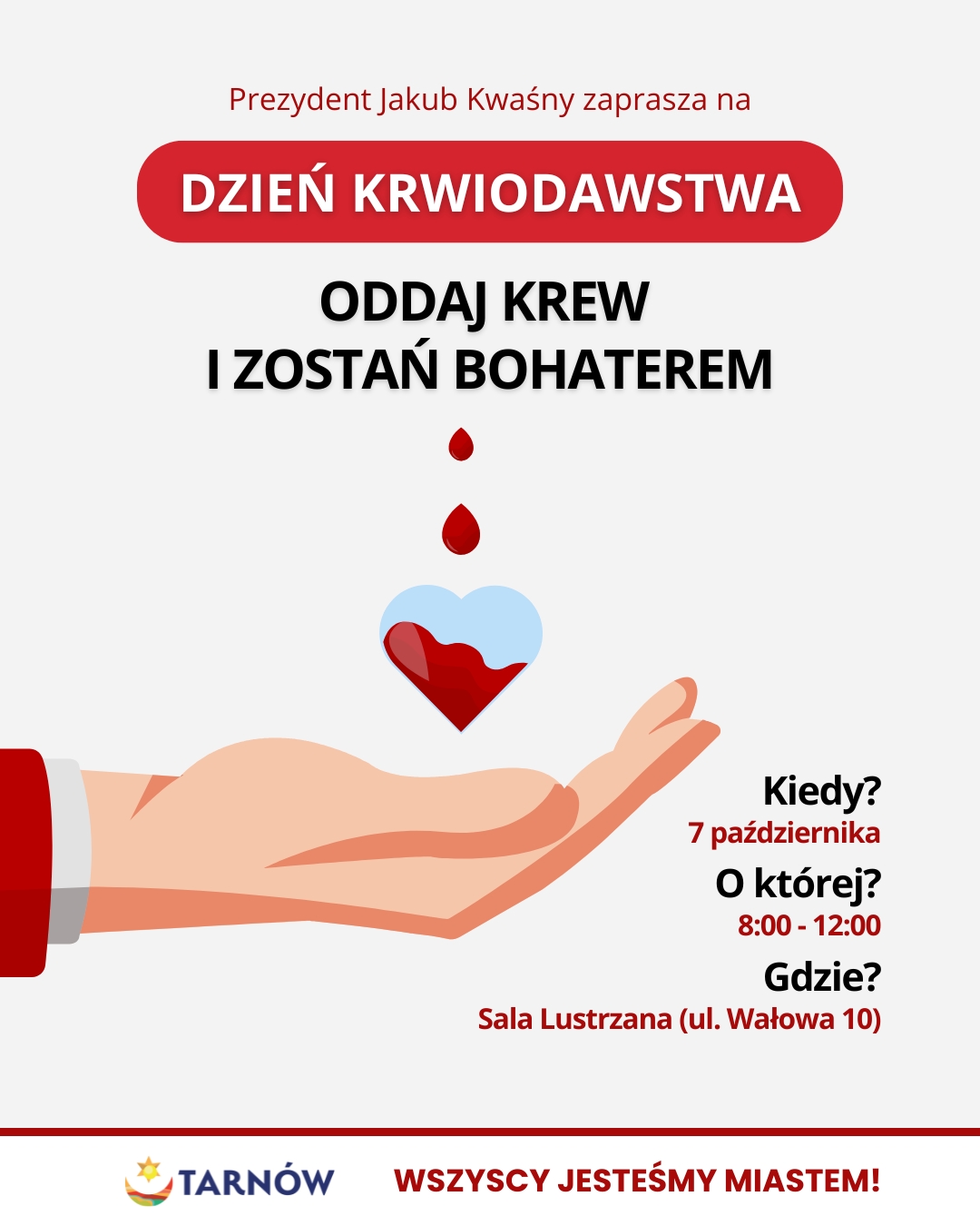 Już jutro, 7 października, mobilny punkt krwiodawstwa pojawi się w centrum Tarnowa. Każdy, kto chce pomóc, może przyjść do Sali Lustrzanej (ul. Wałowa 10) w godzinach 8–12.