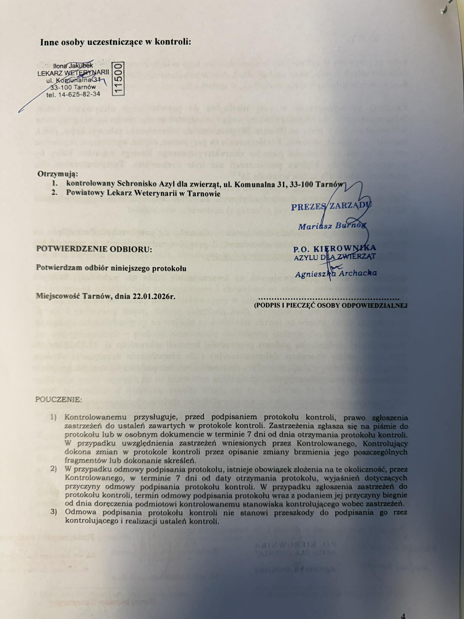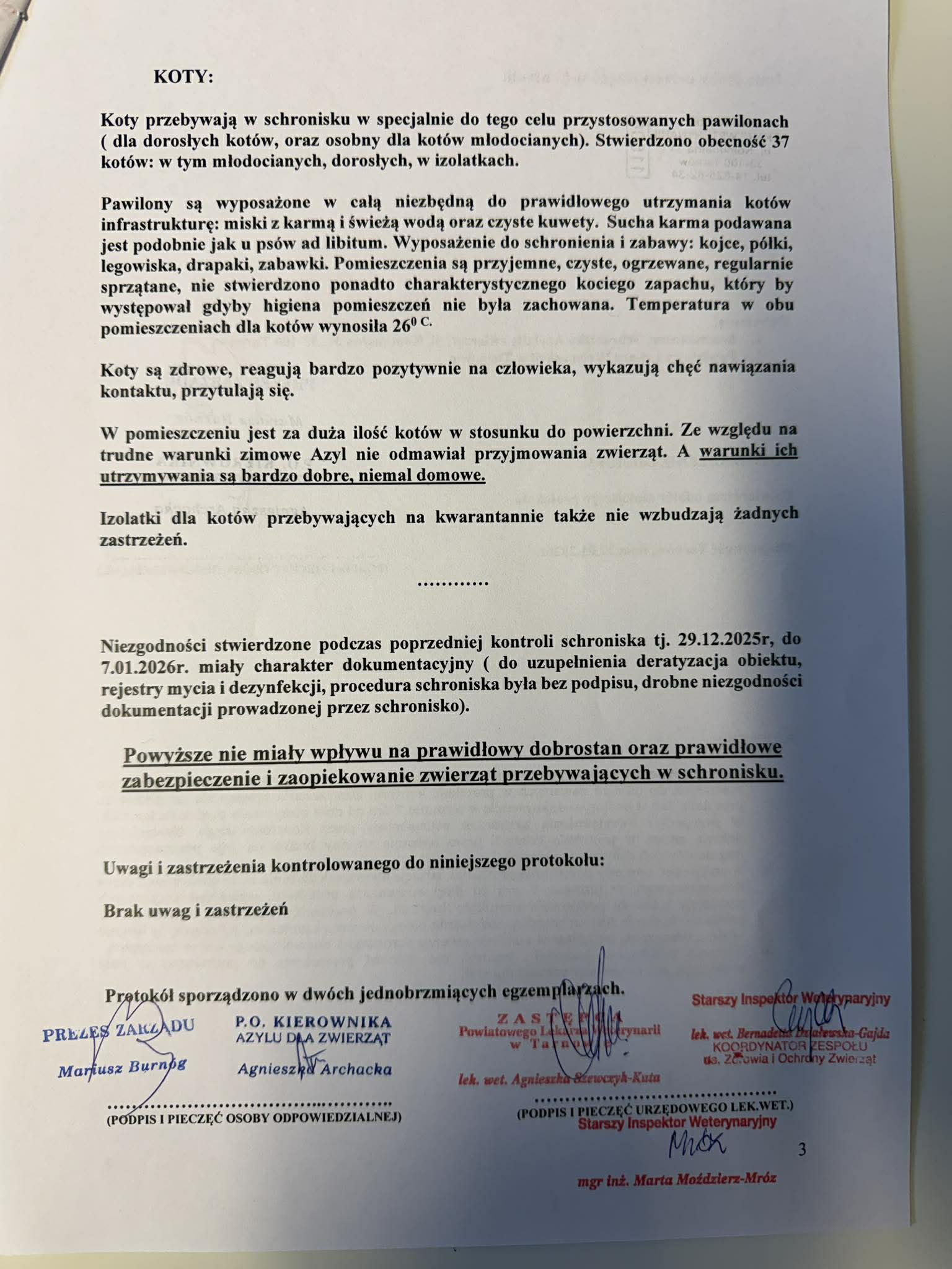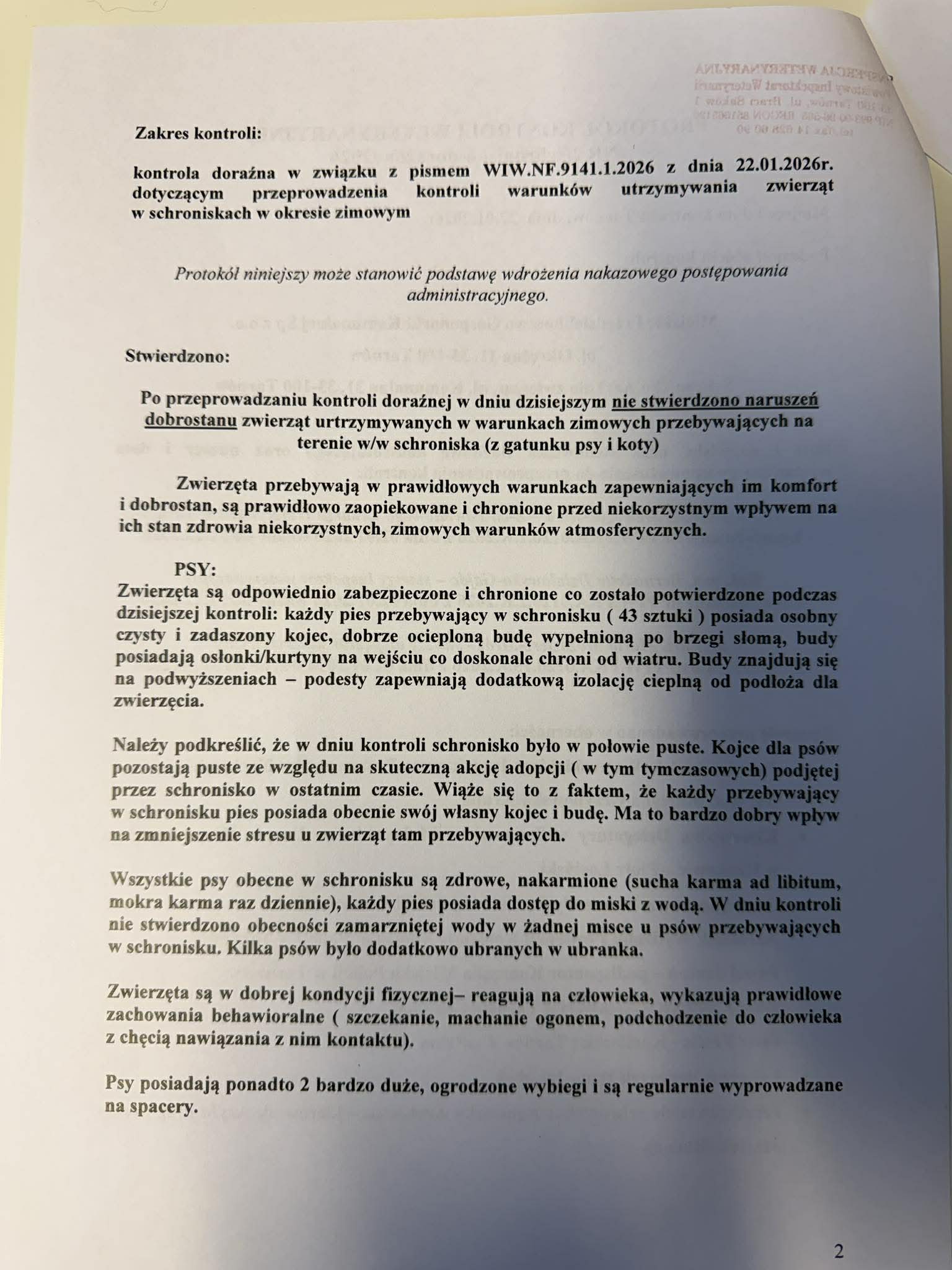 Kontrola wykazała również, że wcześniej wskazywane niezgodności miały wyłącznie charakter formalno-dokumentacyjny (m.in. dotyczący uzupełnienia rejestrów) i nie miały ani nie mają wpływu na bezpieczeństwo, zdrowie ani warunki bytowe zwierząt. Informacja ta została jednoznacznie zawarta w protokole kontroli.