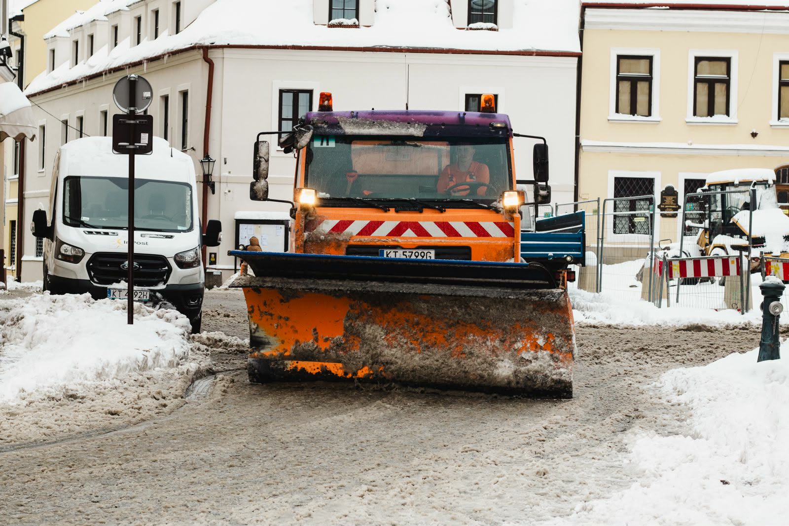 Na zdjęciu samochód odśnieżający wjazd do rynku