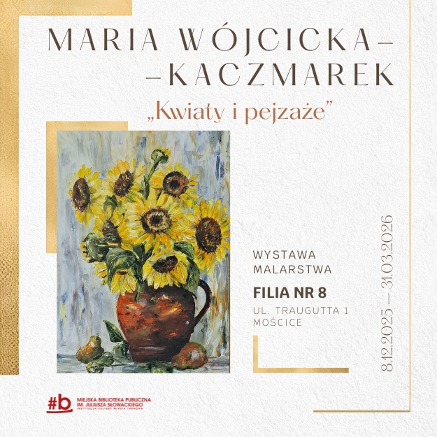 Od poniedziałku, 8 grudnia w filii nr 8 Miejskiej Biblioteki Publicznej w Tarnowie przy ul. Traugutta 1 oglądać będzie można wystawę malarstwa „Kwiaty i pejzaże” Marii Wójcickiej-Kaczmarek.