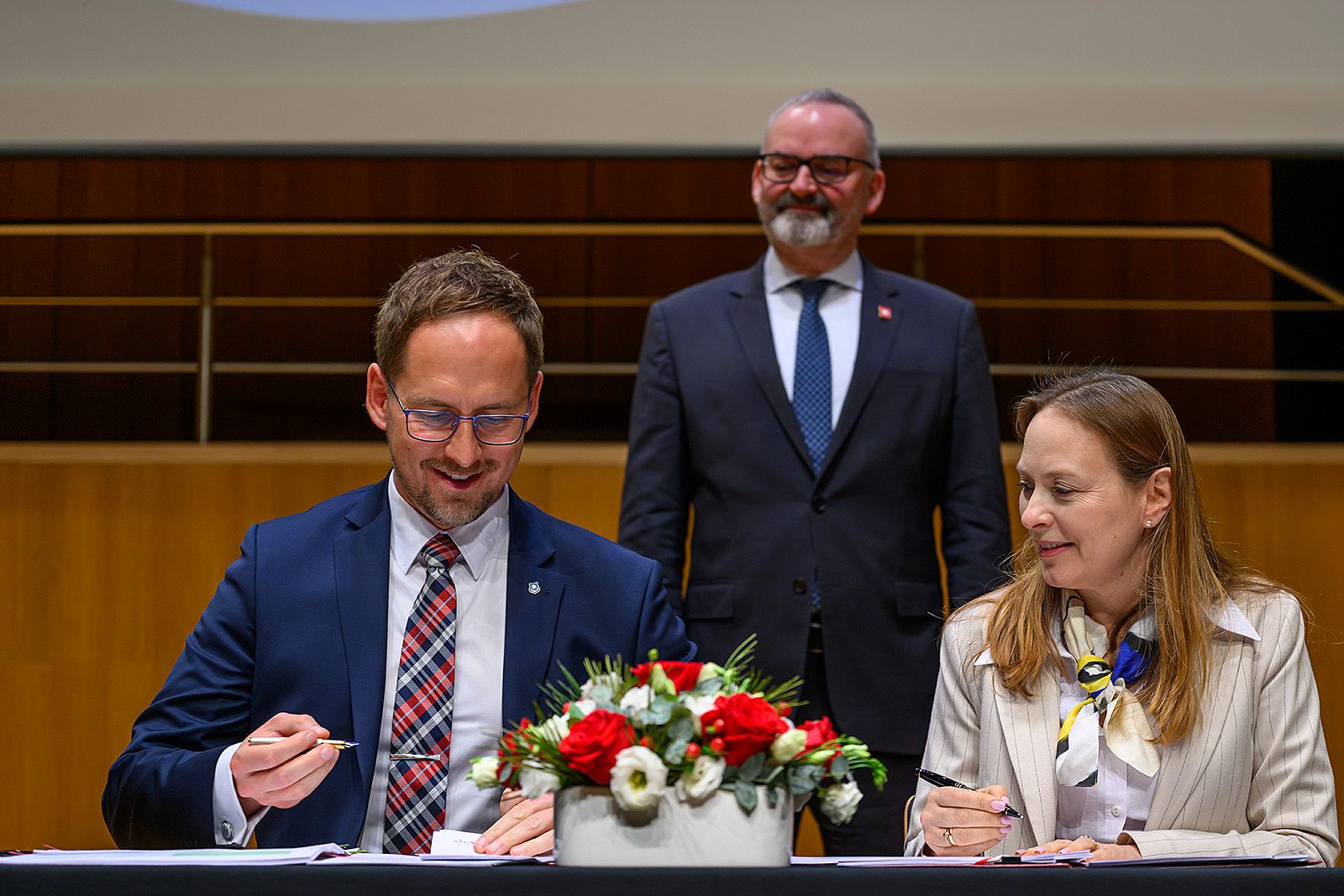 Na zdjęciu prezydent Jakub Kwaśny i ministra Katarzyna Pełczyńska-Nałęcz, którzy podpisują umowy do projektu "Idea Tarnów", z tyłu stoi amasador Szwajcarii w Polsce Fabrice Filliez.