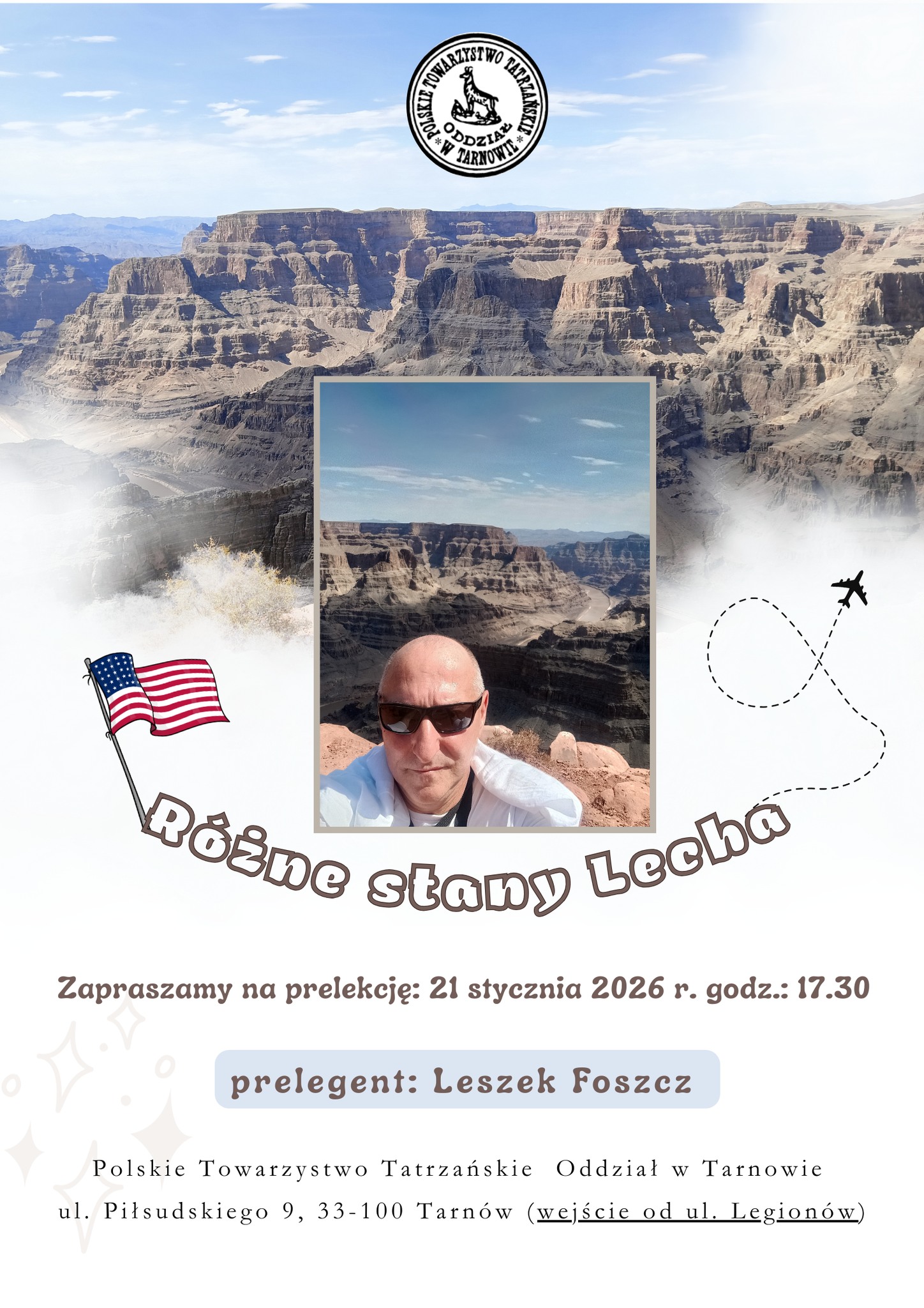 Polskie Towarzystwo Tatrzańskie Oddział w Tarnowie, zaprasza w najbliższą w środę, 21 stycznia na prelekcję „Różne stany Lecha”. Podczas spotkania Leszek Foszcz opowie o swojej podróży po USA.