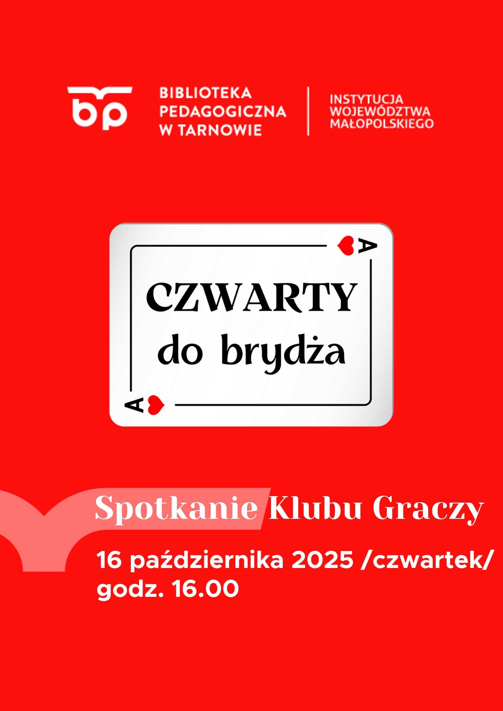 Już w najbliższy czwartek, 16 października, w Bibliotece Pedagogicznej przy ul. Nowy Świat 30 odbędzie się spotkanie Klubu Graczy „Czwarty do brydża”. Początek o godz. 16.