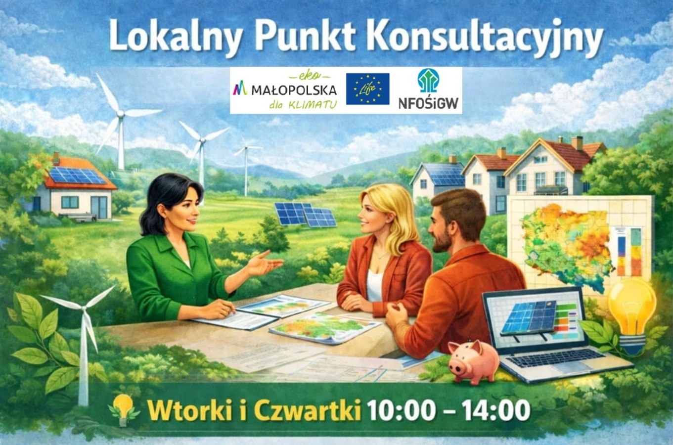 Lokalny Punkt Konsultacyjny utworzony został w ramach projektu zintegrowanego LIFE-IP EKOMAŁOPOLSKA „Wdrażanie Regionalnego Planu Działań dla Klimatu i Energii dla województwa małopolskiego (LIFE-IP EKOMALOPOLSKA/LIFE 19 IPC/PL/000005), dofinansowanego ze środków programu LIFE Unii Europejskiej oraz Narodowego Funduszu Ochrony Środowiska i Gospodarki Wodnej.