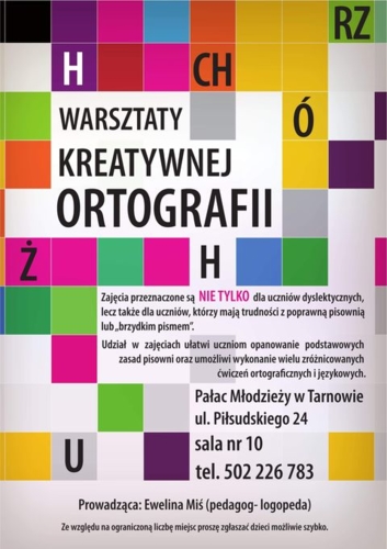 Czy Wasze dzieci mają problem z wymową? Może popełniają błędy ortograficzne? Jeżeli tak, te zajęcia są dla nich. Trwa nabór do „Warsztatów kreatywnej ortografii” oraz „Pracowni Poprawnej Wymowy z elementami edukacji kulturowej” w Pałacu Młodzieży. Zajęcia są bezpłatne.