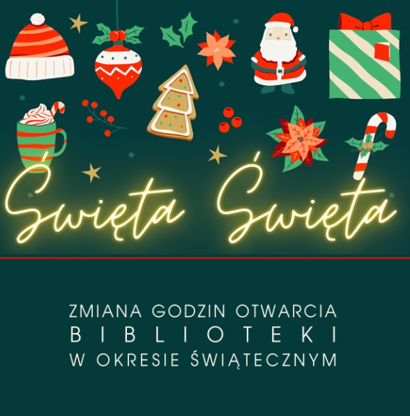W piątki 23 i 30 grudnia, biblioteka czynna będzie wyjątkowo w godzinach od 9 do 15. W wigilijną sobotę oraz w sylwester (24 i 31 grudnia) biblioteka będzie nieczynna. W pozostałe dni placówki będą otwarte według stałych godzin.