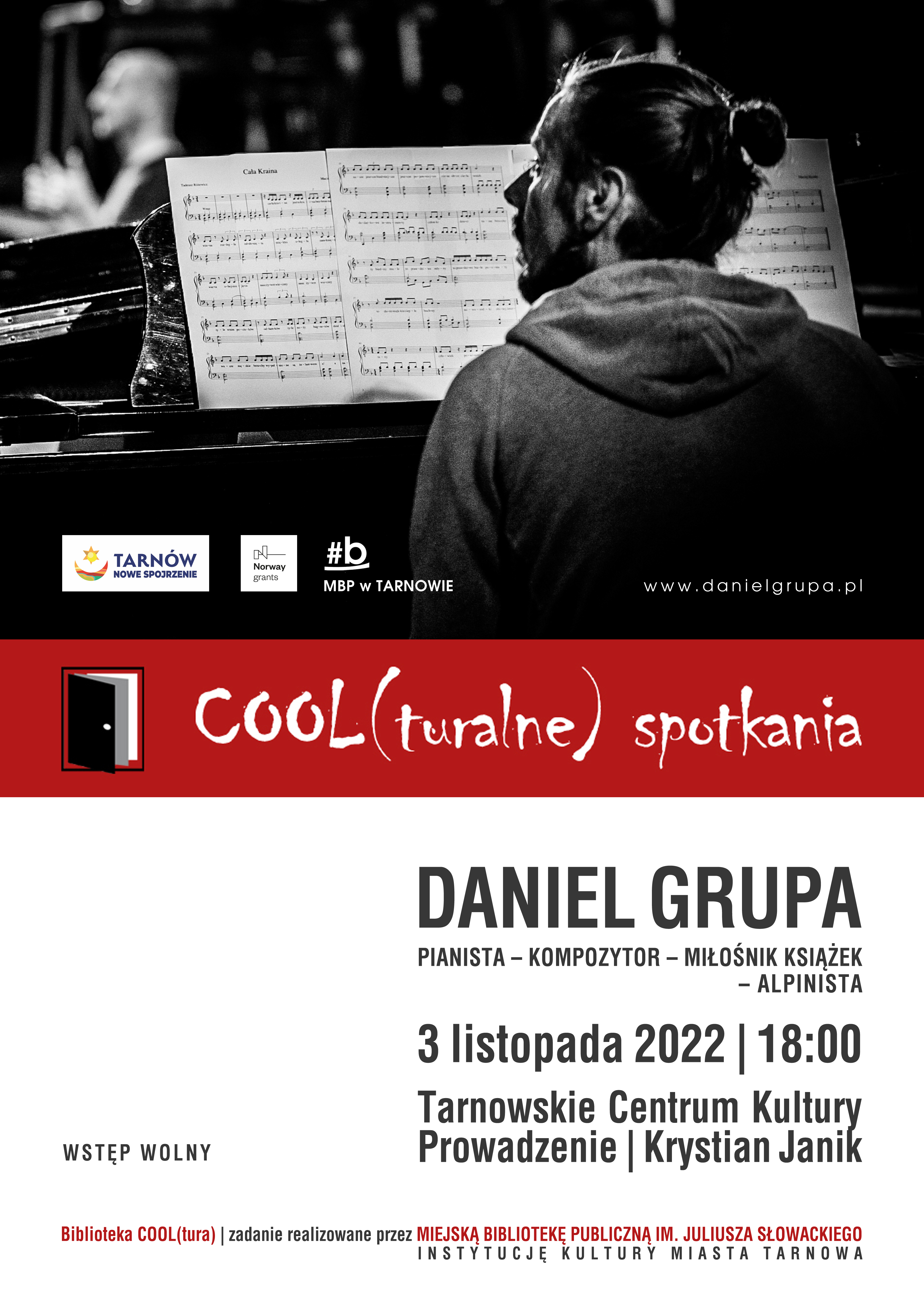 Pierwszym gościem nowego cyklu wydarzeń „COOL(turalne) spotkania”, organizowanego przez Miejską Bibliotekę Publiczną w Tarnowie, będzie Daniel Grupa. Prowadzone przez Krzysztofa Janika spotkanie z pianistą, kompozytorem, alpinistą, miłośnikiem książek i vlogerem literackim odbędzie się jutro (czwartek, 3 listopada) o godz. 18 w Tarnowskim Centrum Kultury i wzbogacone będzie slajdowiskiem. Wstęp wolny.