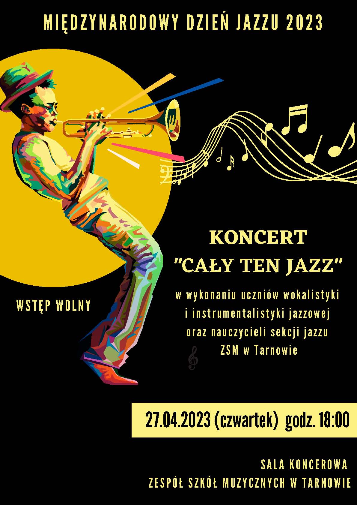 Koncert „Cały ten jazz” zaplanowano z okazji międzynarodowego dnia jazzu. Na scenie wystąpią uczniowie wokalistyki i instrumentalistyki jazzowej oraz nauczyciele z ZSM.