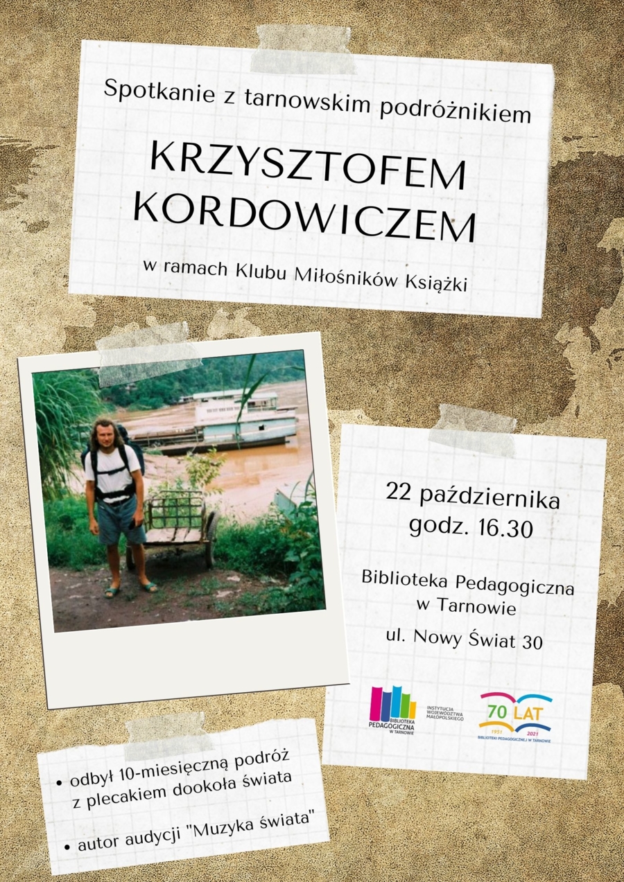 Tym razem Biblioteka Pedagogiczna postanowiła zorganizować nietypowe spotkanie Klubu Miłośników Książek, podczas którego pojawi się Krzysztof Kordowicz. Tarnowski podróżnik odbył m.in. 10-miesięczną podróż z plecakiem dookoła świata. Był również autorem radiowej audycji „Muzyka świata". Wydarzenie odbędzie się w najbliższy piątek, 22 października.