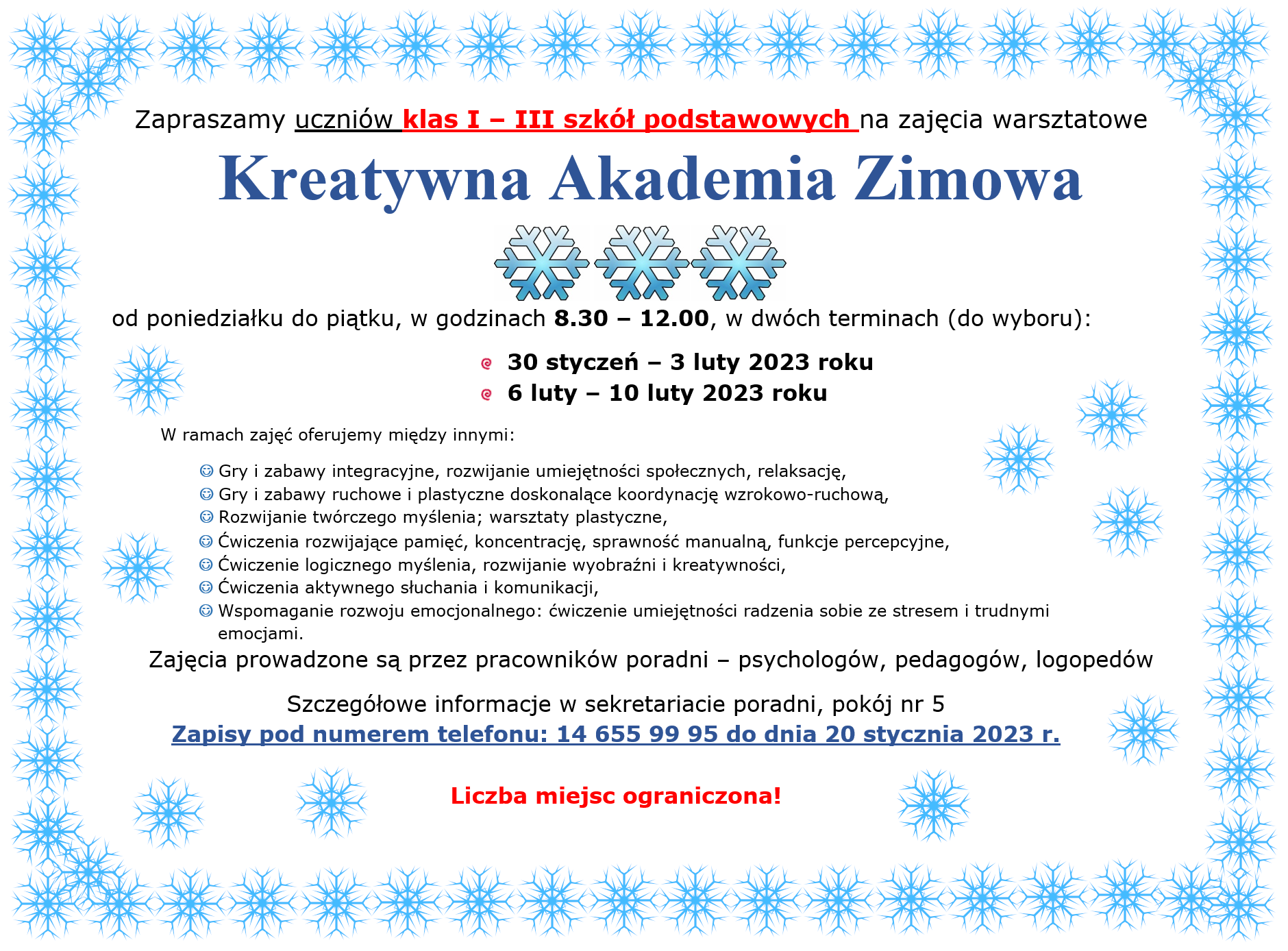 Zapisy będą przyjmowane do 20.01.2023 r. Zgłoszeń można dokonywać osobiście w sekretariacie poradni przy ul. Chyszowskiej 3 lub telefonicznie 14 655 99 95. Decyduje kolejność zgłoszeń.
