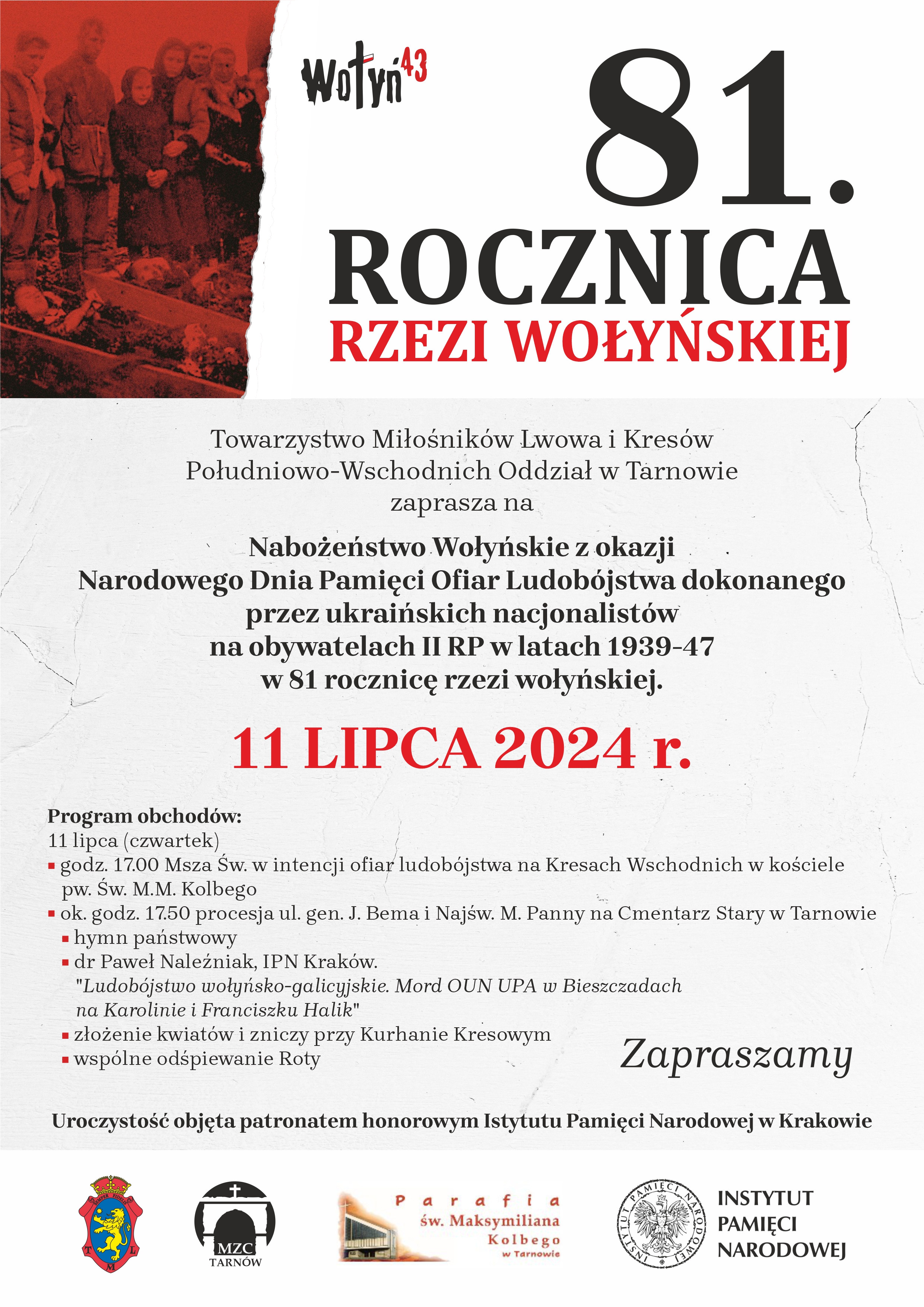 Towarzystwo Miłośników Lwowa i Kresów Południowo-Wschodnich Oddział w Tarnowie, zaprasza dzisiaj (czwartek 11 lipca) na nabożeństwo wołyńskie z okazji Narodowego Dnia Pamięci Ofiar Ludobójstwa dokonanego przez ukraińskich nacjonalistów na obywatelach II RP w latach 1939-1947.