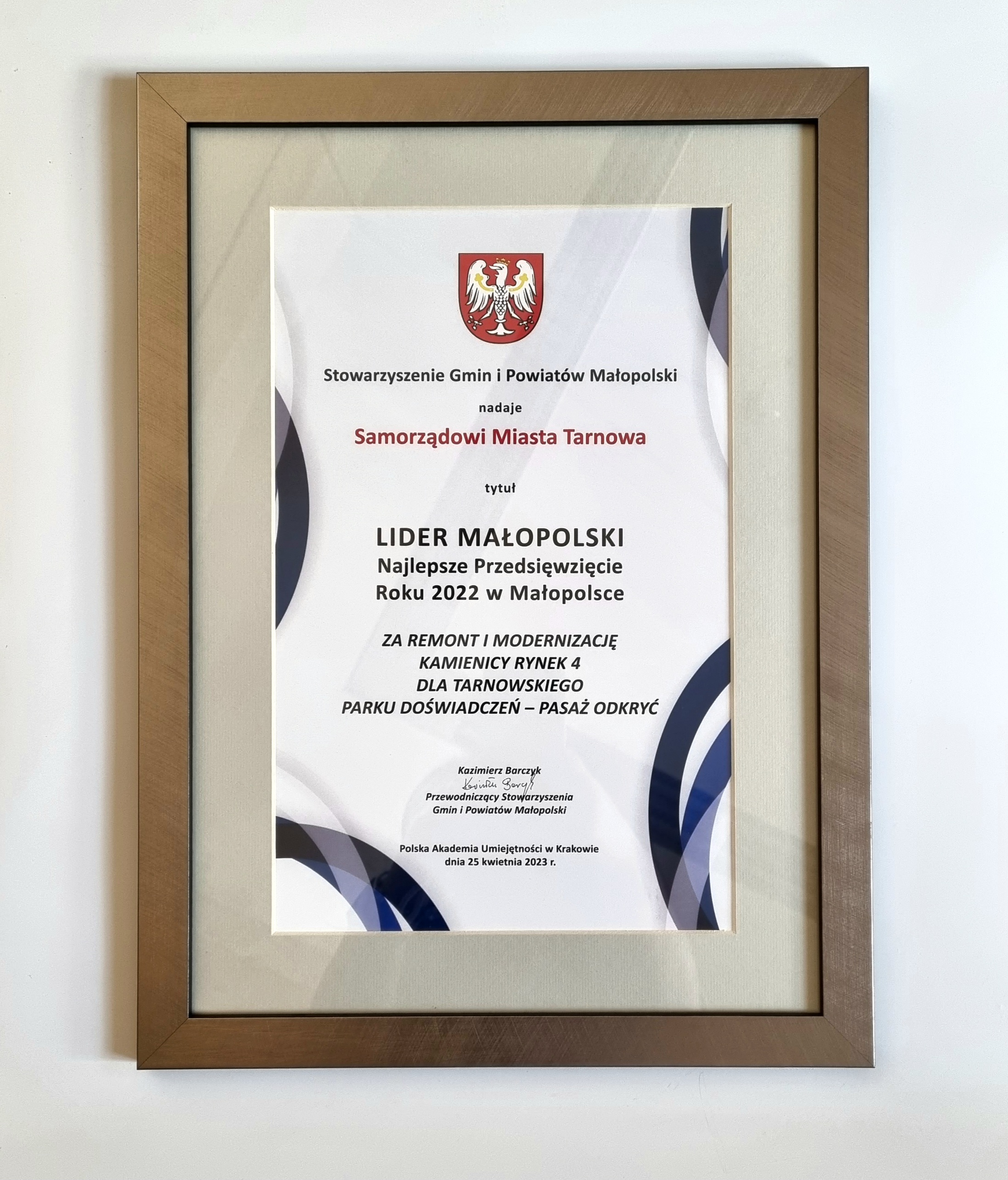 Tarnowski Pasaż Odkryć, który został otwarty na początku września, znalazł się na liście 10 najlepszych przedsięwzięć 2022 roku w Małopolsce. Uroczyste wręczenie tytułów odbyło się w Krakowie w auli Polskiej Akademii Umiejętności. Dyplom podczas wydarzenia odebrała zastępczyni prezydenta Tarnowa, Agnieszka Kawa.