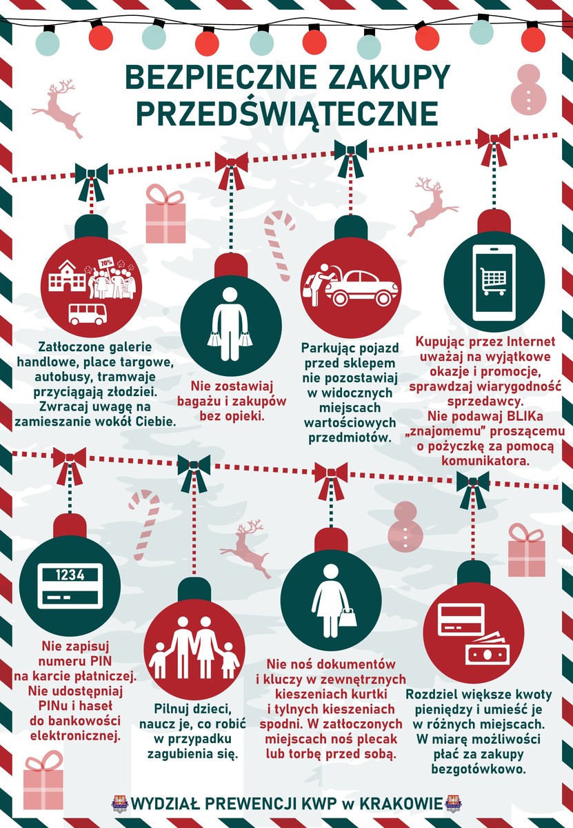 Wybierając się po świąteczne zakupy pamiętajmy, by zwracać uwagę na otoczenie. - Nie trzymajmy w tylnych kieszeniach ważnych dokumentów oraz cennych przedmiotów. Na zakupy zabierajmy tylko potrzebną ilość pieniędzy i nie chowajmy gotówki w jednym miejscu. Zawsze informujmy policję o osobach zachowujących się podejrzanie – można przeczytać na stronie policji.
