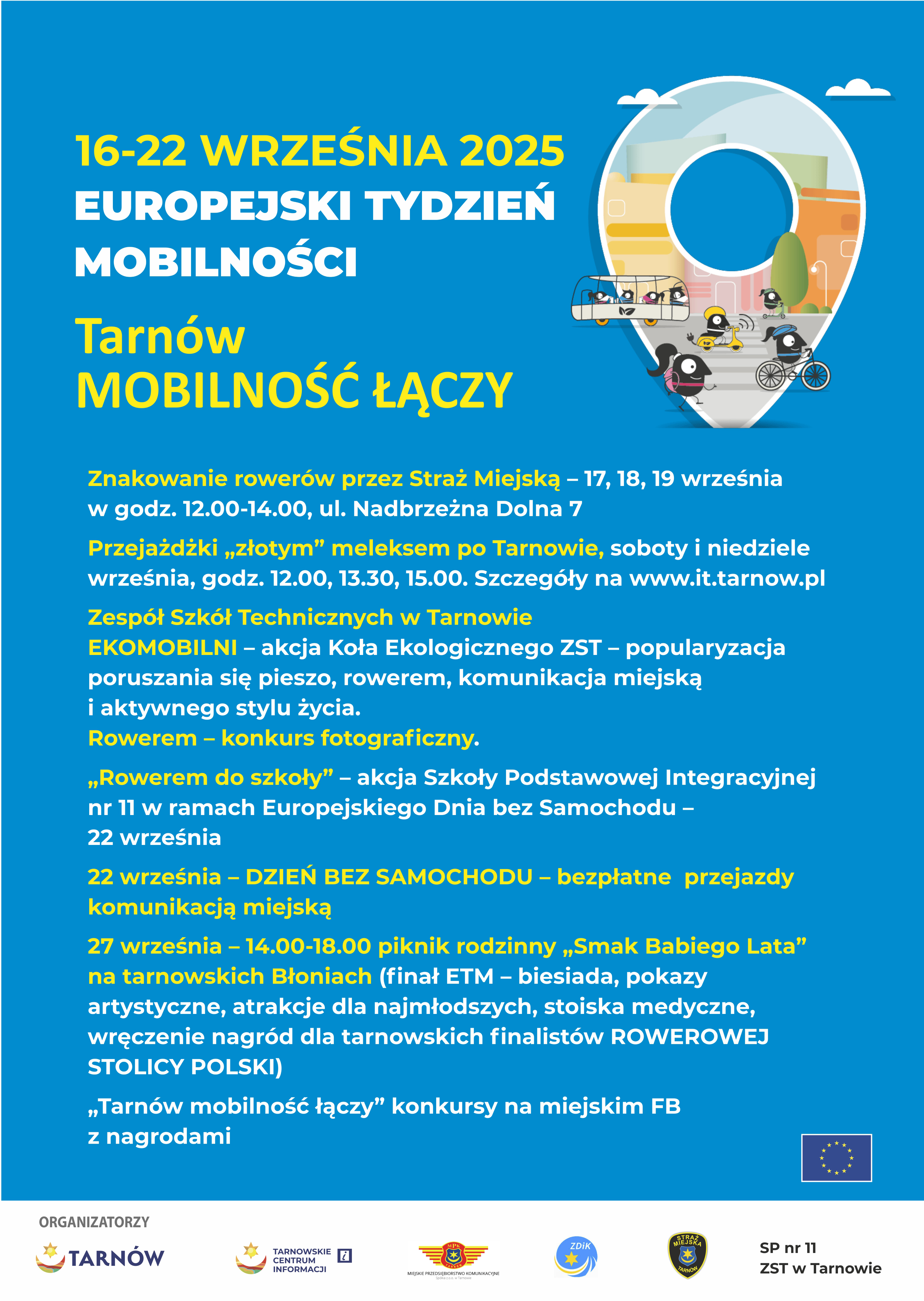 Tydzień mobilności obejmuje też piknik rodzinny „Smak Babiego Lata" na tarnowskich błoniach 27 września (godz. 14-18), akcję „Rowerem do szkoły” Szkoły Podstawowej Integracyjnej nr 11 (22 września) i popularyzację poruszania się pieszo, rowerem lub komunikacją miejską przez Zespół Szkół Technicznych w Tarnowie.