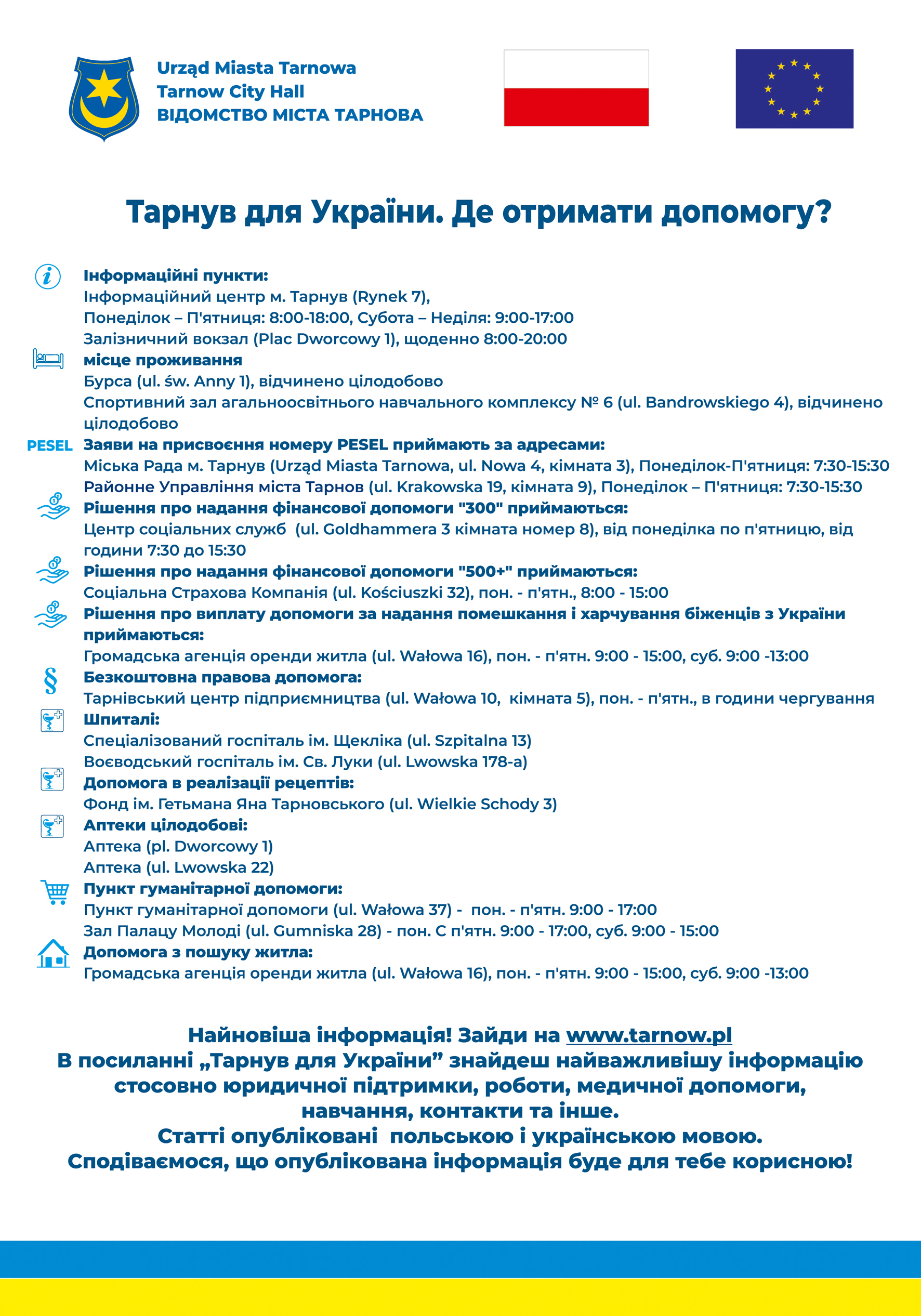 Punkt informacyjny dla uchodźców można znaleźć w Tarnowskim Centrum Informacji przy Rynku 7. Działa od poniedziałku do piątku w godzinach od 8 do 18, a w soboty i niedziele w godzinach od 9 do 17. Drugi punkt znajduje się na Dworcu PKP (Plac Dworcowy 1) i działa codziennie od godziny 8 do 20. Tam każdy obywatel Ukrainy, który ucieka przed wojną, otrzyma wszystkie podstawowe informacje dotyczące miejsc zakwaterowania, pomocy materialnej i żywnościowej czy opieki medycznej.