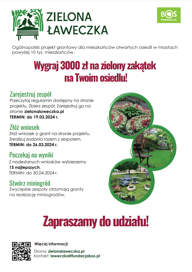 Fundacja Banku Ochrony Środowiska uruchomiła nową edycję projektu grantowego „Zielona ławeczka”, w ramach którego grupy sąsiedzkie z miast powyżej 10 tysięcy mieszkańców mogą składać wnioski na realizację wymarzonego zielonego zakątka na swoim osiedlu. Celem projektu jest zmiana zaniedbanych terenów na osiedlach w miniogrody z ławką, jego efektem będą zielone przestrzenie do odpoczynku i spotkań.