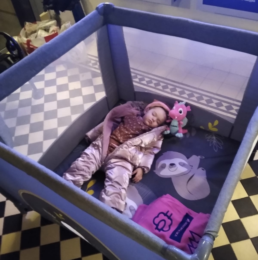 Na zdjęciu: mały obywatel Ukrainy odsypia w specjalnym punkcie na tarnowskim dworcu PKP kilkudniową podróż.