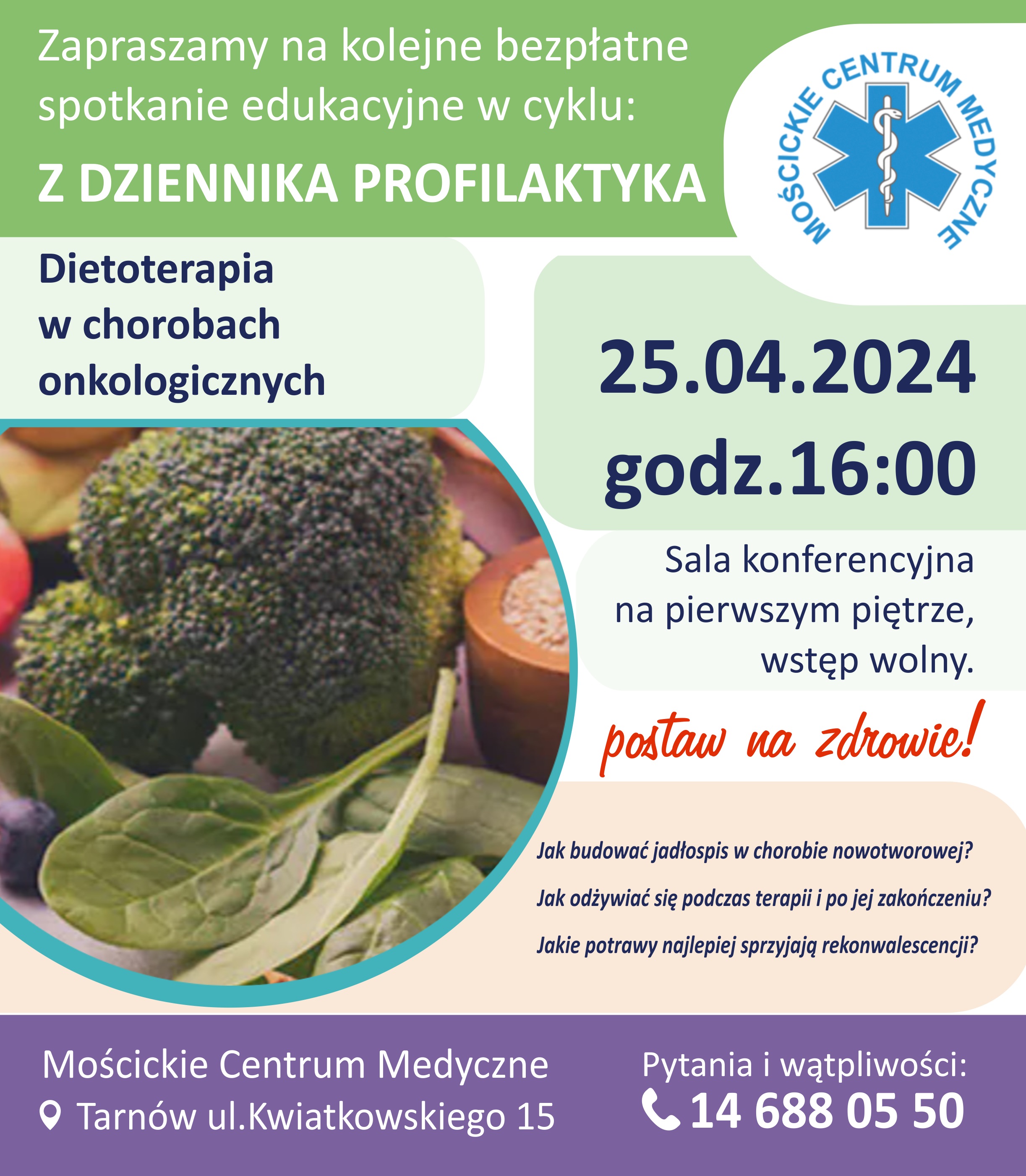 Co jeść, kiedy dowiadujemy się o chorobie onkologicznej? Jak modyfikować jadłospis podczas terapii i po jej zakończeniu? Jakie potrawy sprzyjają rekonwalescencji? Odpowiedzi na te i podobne pytania poznać będzie można podczas kolejnej edukacyjnej porady zdrowotnej z cyklu „Z dziennika profilaktyka” w Mościckim Centrum Medycznym.