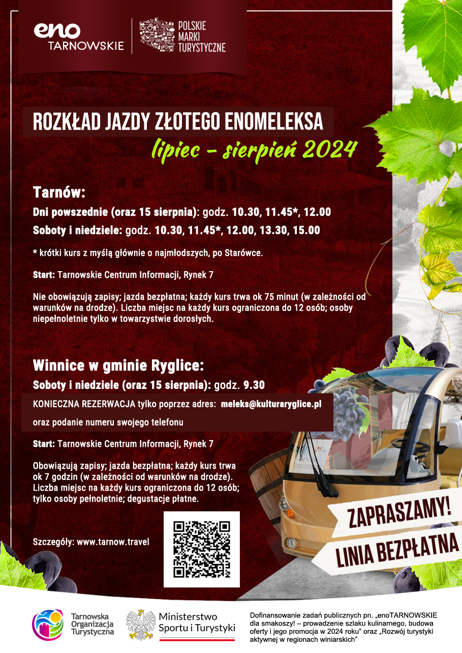 W każdą sobotę i niedzielę lipca i sierpnia (oraz 15 sierpnia) spod Tarnowskiego Centrum Informacji o godzinie 9.30 będzie wyjeżdżał enomeleks, który zawiezie uczestników akcji do Ryglic. Po drodze na barwnej trasie przewodnik będzie opowiadał o mijanych miejscach i ich historii.